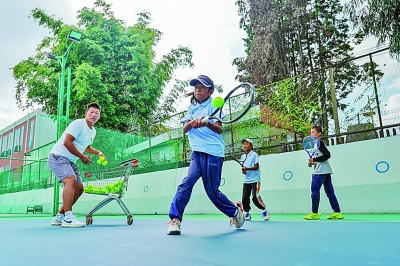 云南昆明,小球员在教练指导下进行网球训练。新华社发