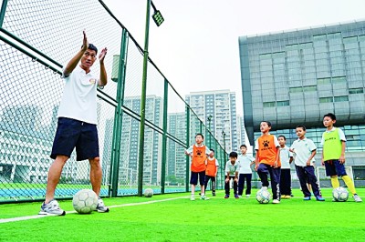 江苏常州,足球教练指导小球员训练。新华社发